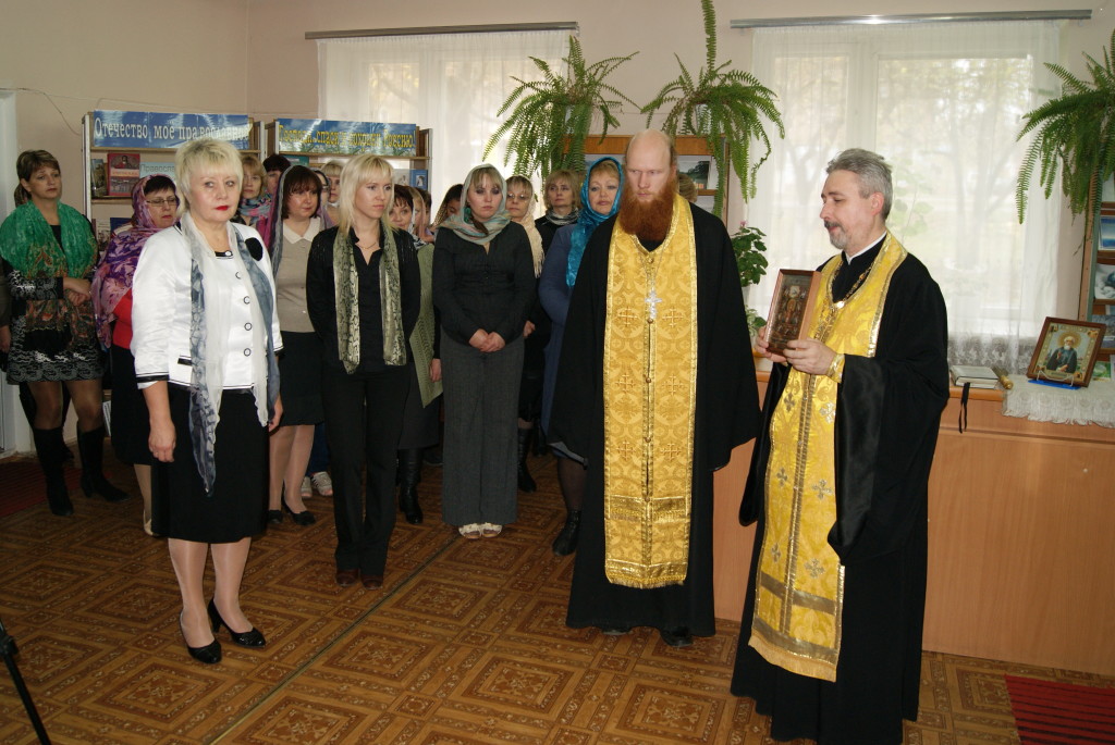 Торжественное мероприятие, как и положено по православной традиции, началось с общей молитвы. Благочинный Сафоновского церковного округа протоиерей Сергий Зеленков вместе с иереем Сергием Гуриновичем и иереем Сергием Чайкиным совершили молебен перед началом доброго дела. Благословив на новые труды коллектив библиотеки, о. Сергий Зеленков преподнес им в дар икону Божией Матери «Знамение», привезенную из города Курска.